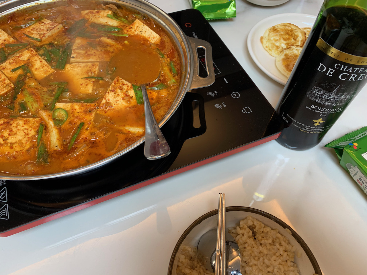 고추장돼지두부찌개에 현미밥을 먹으며 와인을 같이 마셨다. 생각보다 궁합이 괜찮았다. 보통 이런 음식은 막걸리와 잘 어울리는데, 타닌이 있고 산미가 있는 이 와인이 막걸리의 특성과 닮아서 잘 어울리는 것 같다고 근거가 빈약한 생각을 해봤다.
