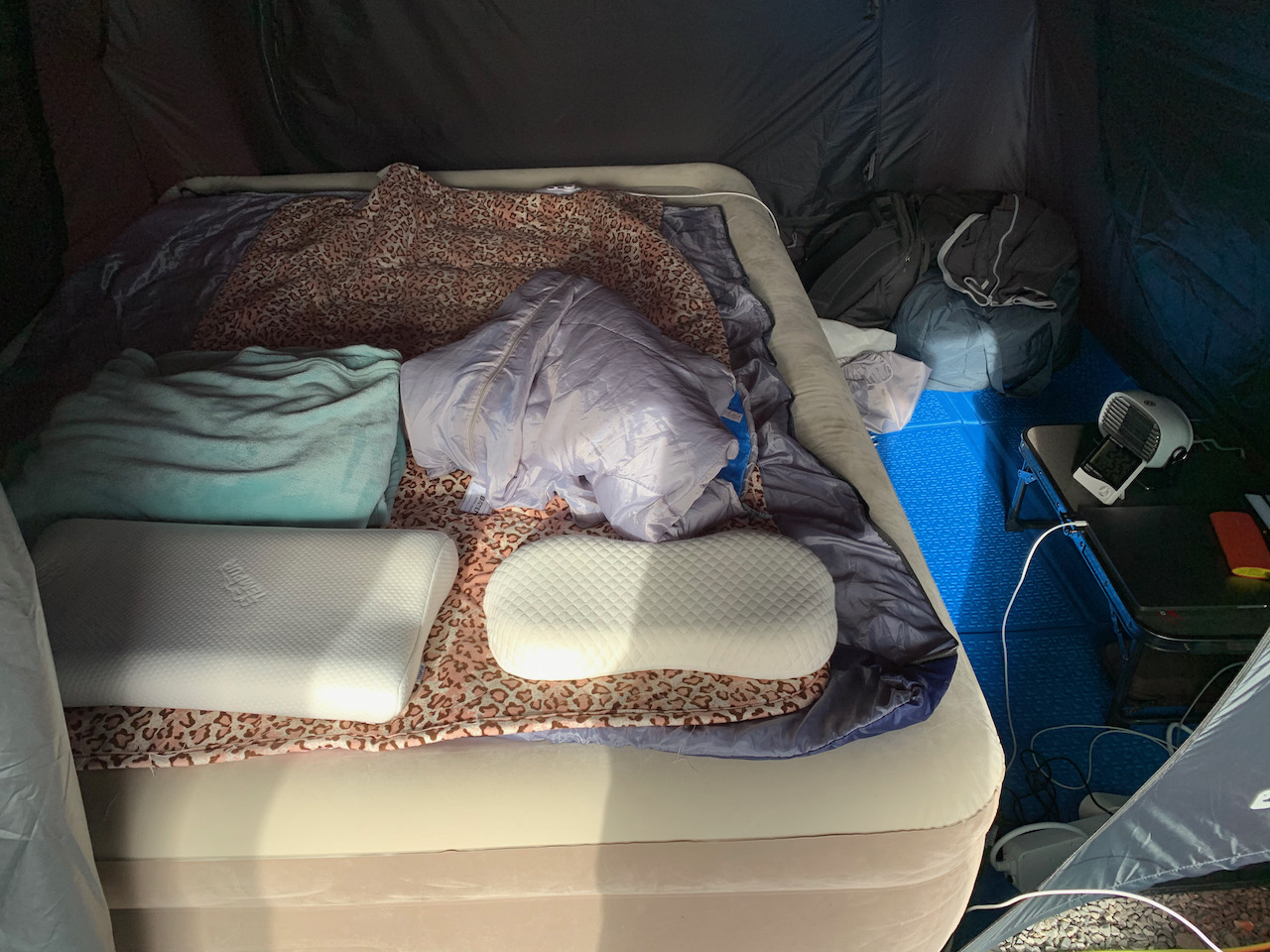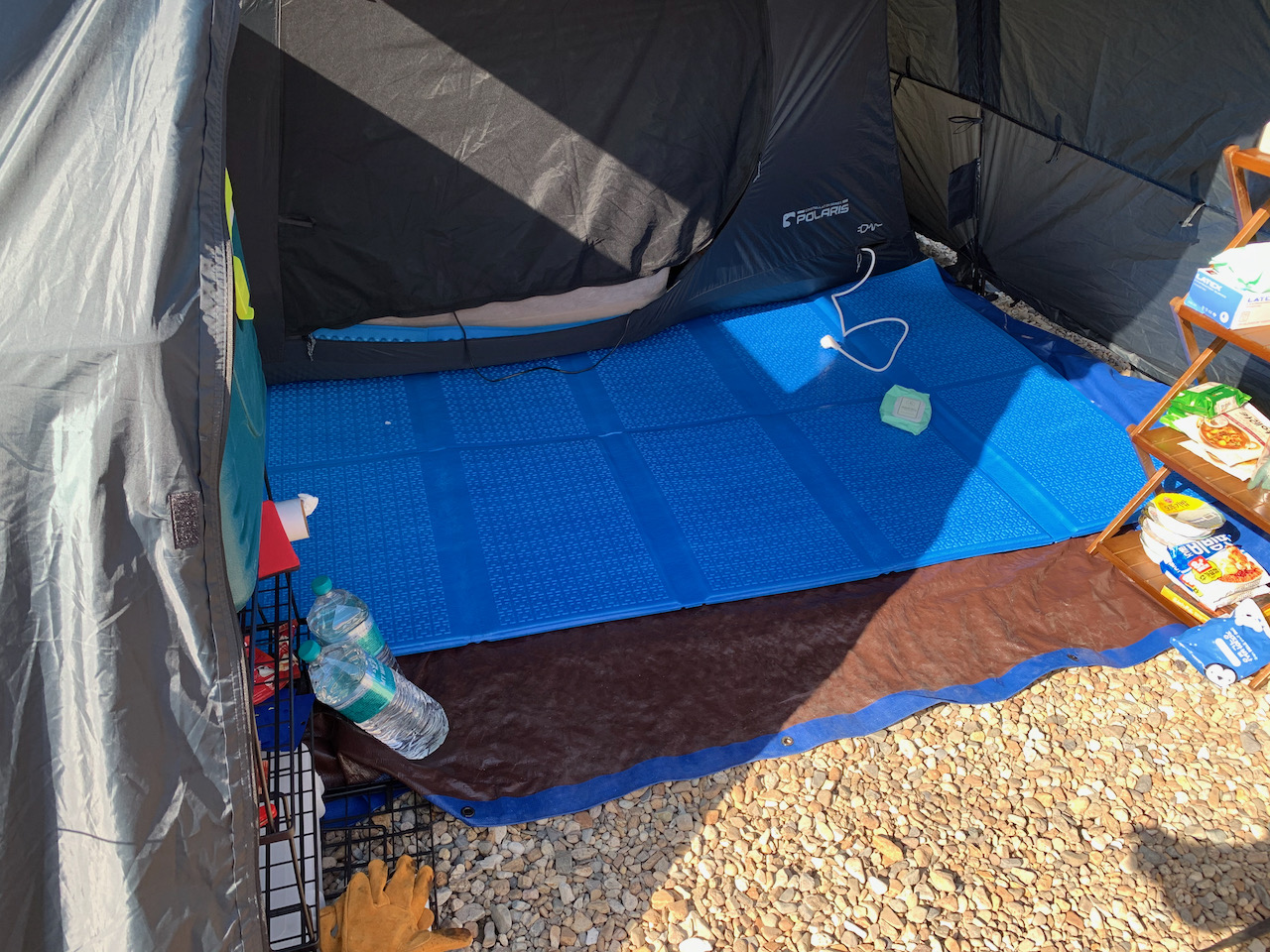 요즘에는 코스트코 방수포를 바닥 전체에 깔고 이너 앞에 발포매트를 깔아서 좌식으로 쓰고 있다. 테이블하고 텐트와 짐들은 타프 밑에 둔다.
