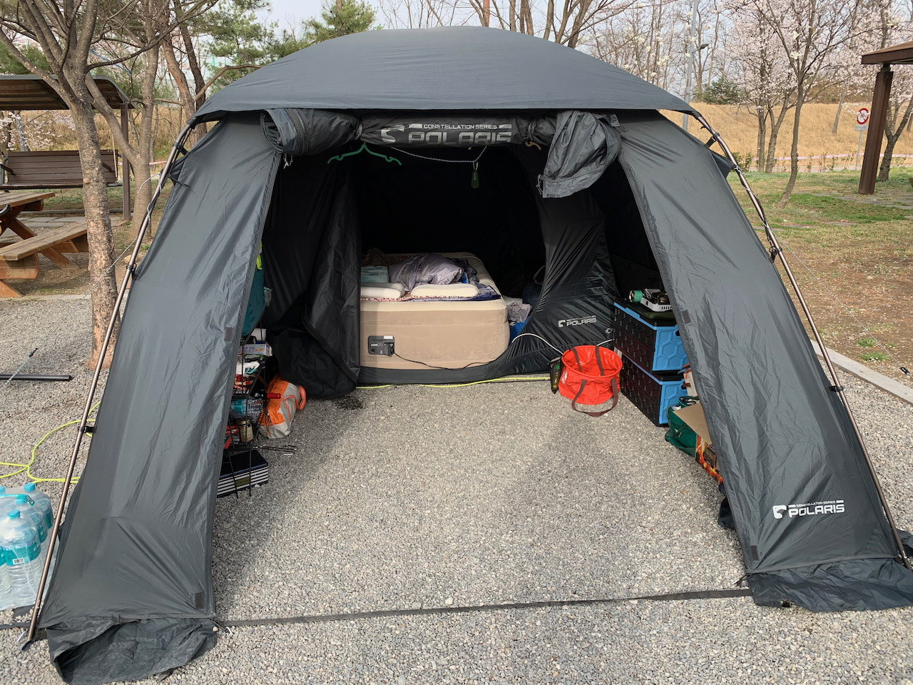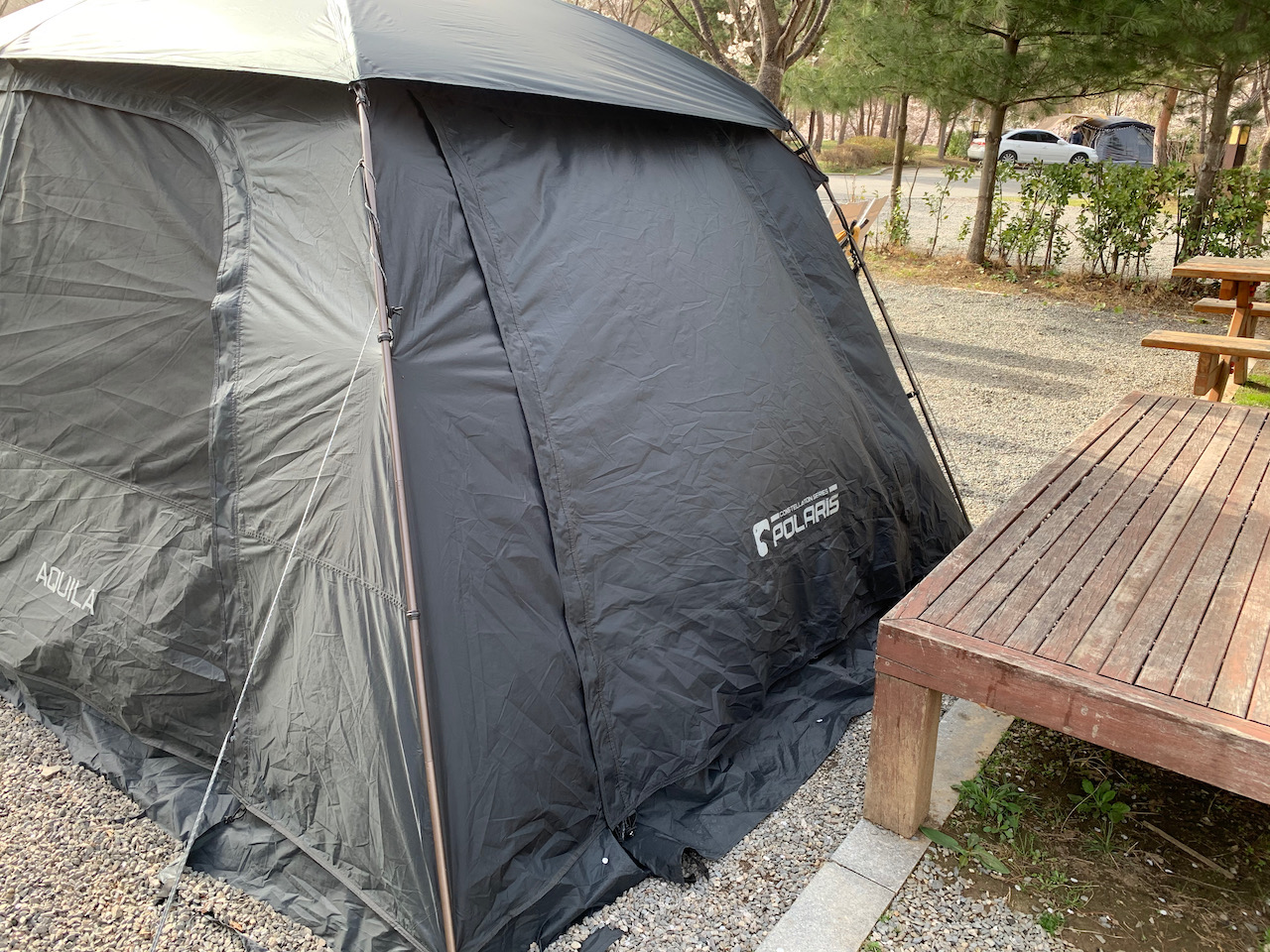 집에 원터치 텐트와 그늘막이 있지만, 만족을 하지 못하고 큰 텐트를 사게 됐다. 뭐 사실, 대형 텐트들에 비하면 그렇게 큰 텐트는 아니지만 둘이서 적당하게 쓸 수 있는 텐트인 폴라리스 아퀼라를 구입했다. 적당한 크기에 가성비 어쩌고 하는 글들에 속아 샀는데, 아직까지는 잘 속았다는 생각이다.