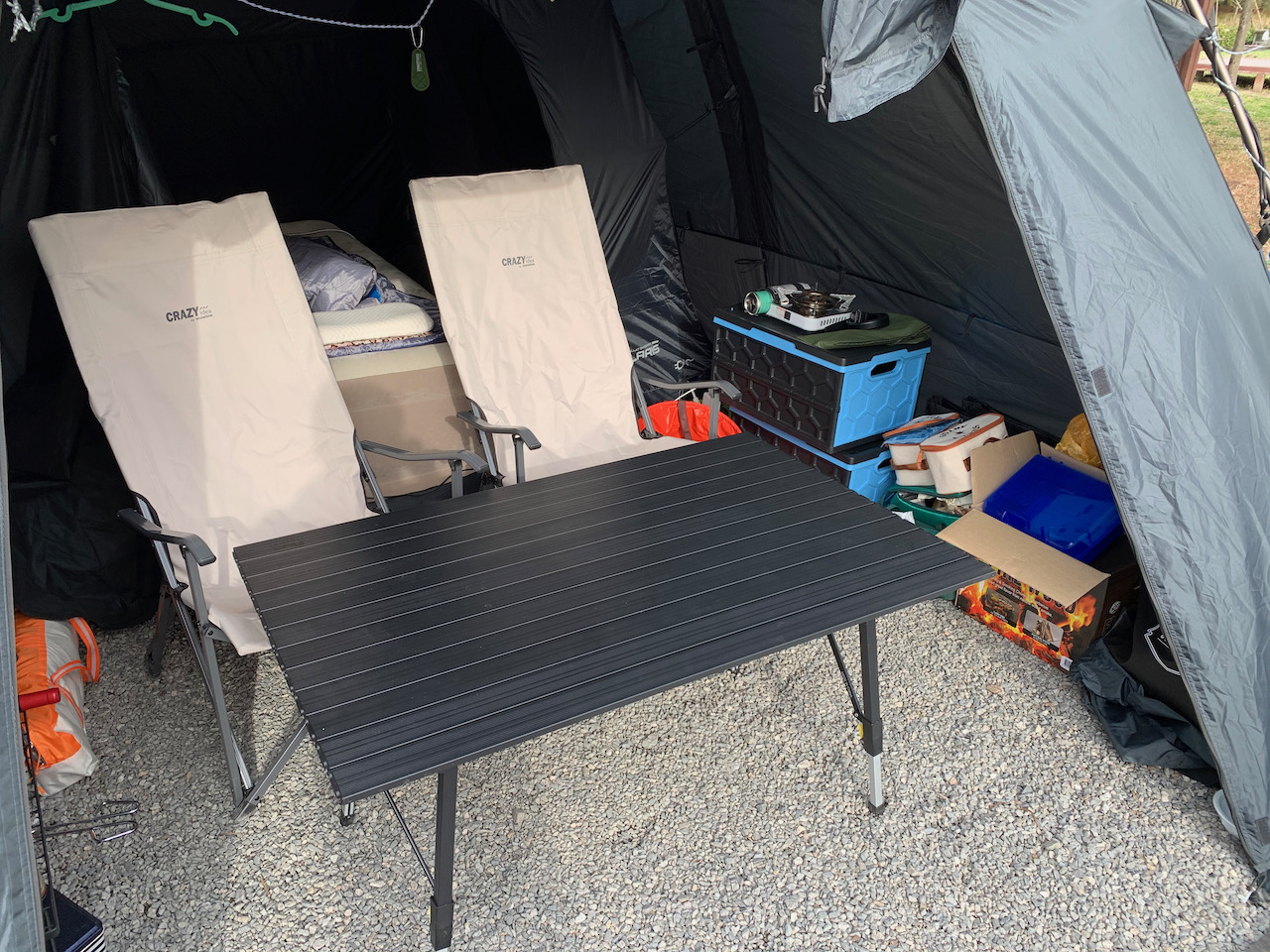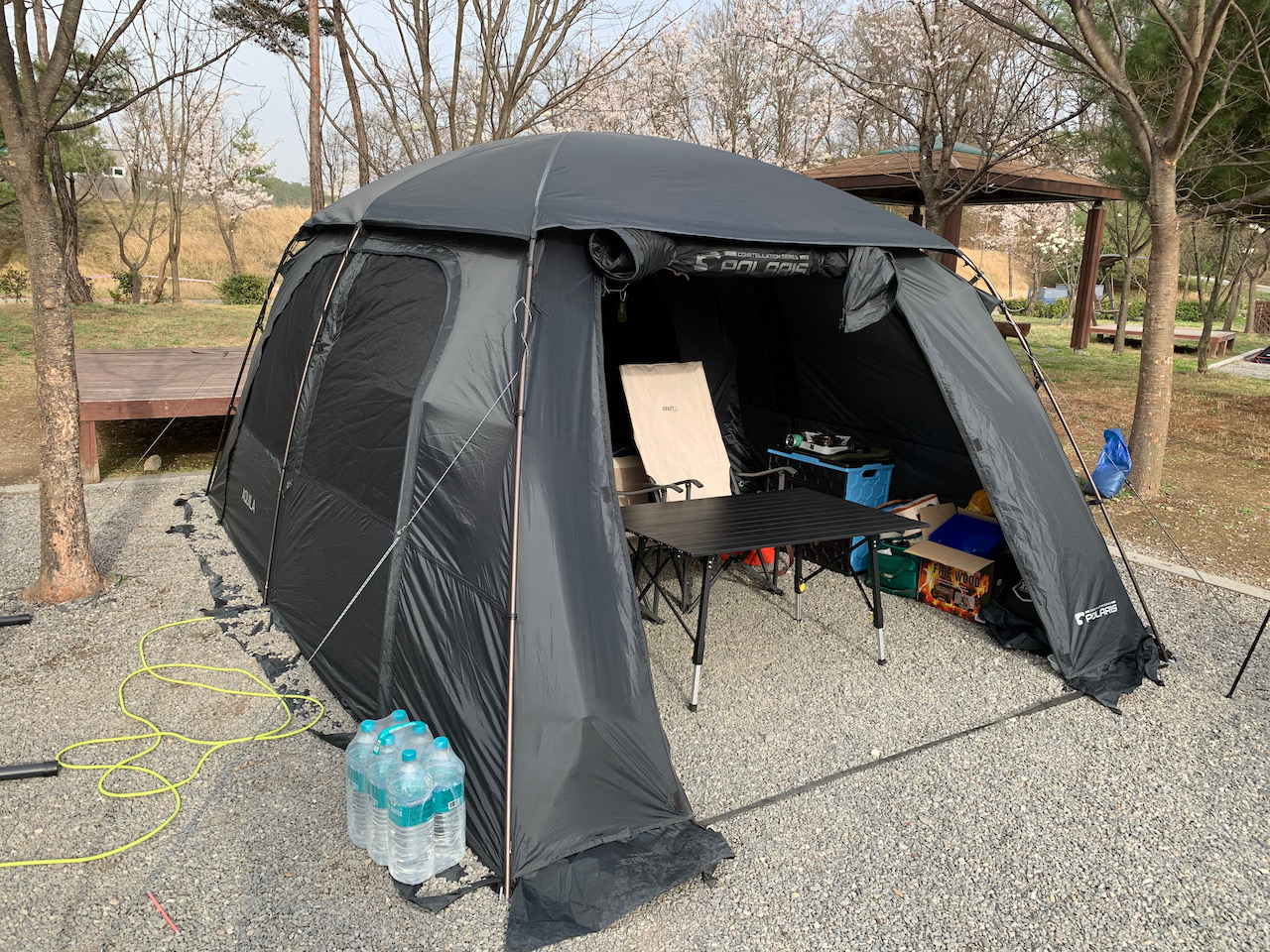 이너 앞의 전실 공간은 릴렉스 체어 두 개와 코스트코 롤테이블이 들어가고 좌우에 이것저것 늘어놓을 정도는 된다. 그런데 밖으로 나가고 들어오는데 불편하고 그렇게 여유롭지는 않다.