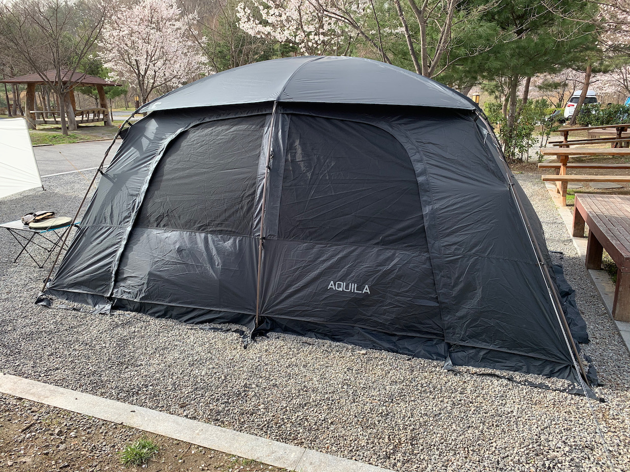 이 텐트를 구입 고려대상에 올려두고 검색해 찾아온 사람들이면 제품 설명 페이지는 몇 번이고 정독했을 테니 스펙에 대한 이야기는 넘어간다. 설치는 두 명이서 처음에 30분 가까이 걸렸다. 지금은 둘이서 15분 내에 이너텐트까지 다 친다. 원터치 텐트만 던져놓던 사람이 보기에는 설치 난이도가 높은 편은 아니다. 유튜브에서 아리에스나 아퀼라 설치하는 영상을 몇 개 보고 가면 좋겠다.