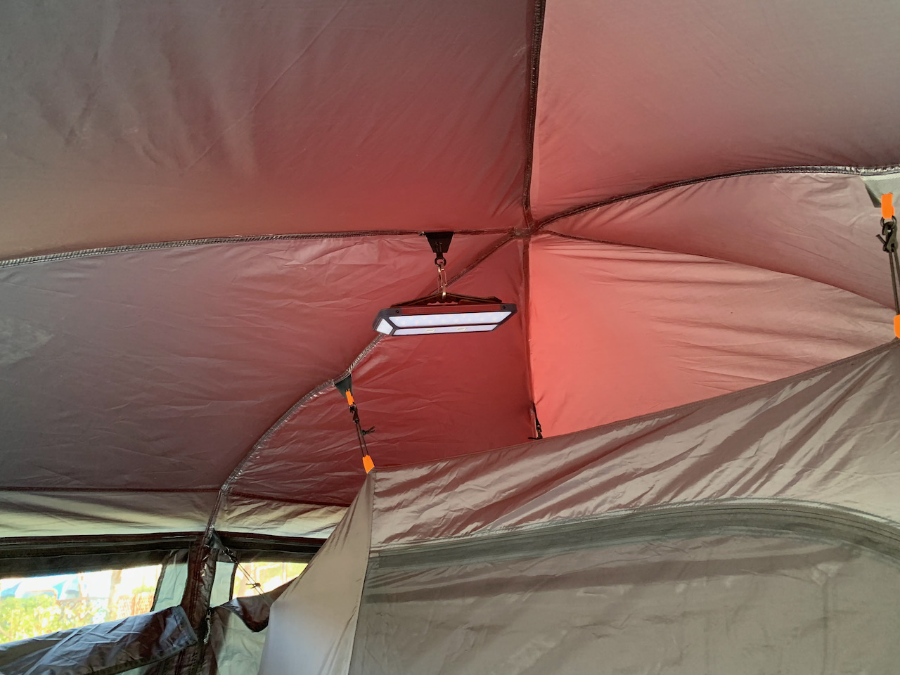 랜턴걸이는 텐트 중앙, 이너 바로 앞에 하나가 있고, 이너 안에는 랜턴걸이가 없다. 이너텐트 사이드에 카라비너를 걸만한 곳이 있어서 걸기는 하는데, 조금 불편하다.