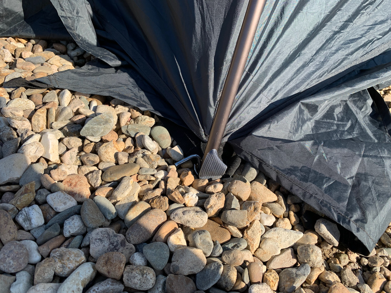 바람이 부는 날에는 텐트 여섯 귀퉁이 중간 부분에 있는 가이라인을 이용해서 텐트의 고정을 더 단단히 할 수 있다. 이게 뭔지는 알고 있었지만, 쓸 일이 있을까 싶었는데, 바람의 변화무쌍함은 내가 놀러 가는 날에는 그 위용을 드러내었다. 그래서 바람 부는 날 급하게 매듭법 공부해서 스트링을 걸고 폴대에 감아서 팩을 박아 연결했었다. 날이 아무리 좋아도 요즘에는 일단 팩 박고 시작한다. 바람은 무섭다.