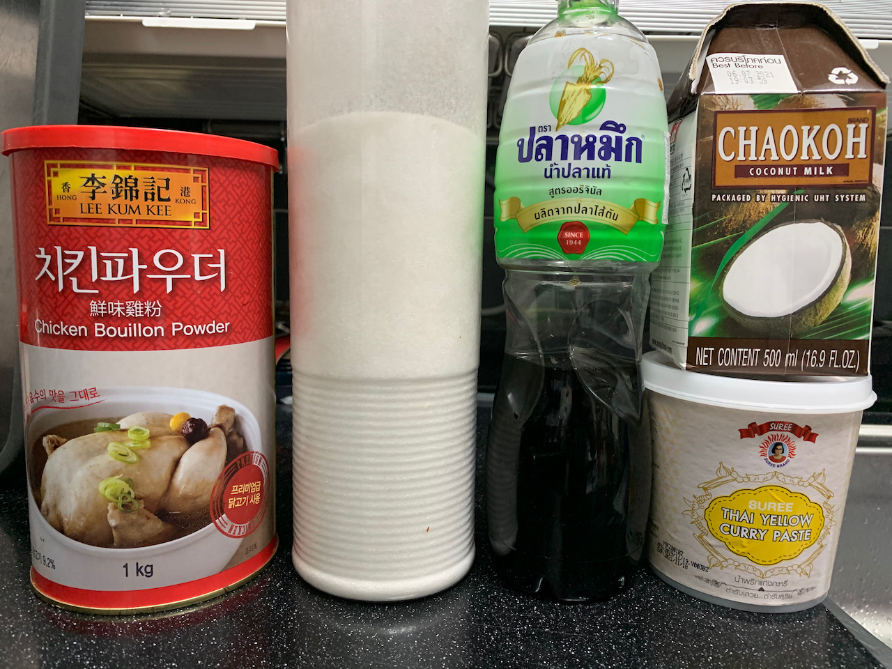 재료들이 다 익으면 간을 한다. 치킨파우더나 스톡이 있으면 반 찻숟가락을 넣어주고 없으면 아예 안 넣어도 무방하다. 설탕은 생각보다 많이 넣어야 맛이 나는데, 얕게 3숟가락을 넣었고 최후의 간은 피시소스로 했다. 커리 위에 떠 있는 것은 카피르 라임 잎인데, 사진 잘 나오라고 넣었다. 맛에는 큰 영향이 없다.