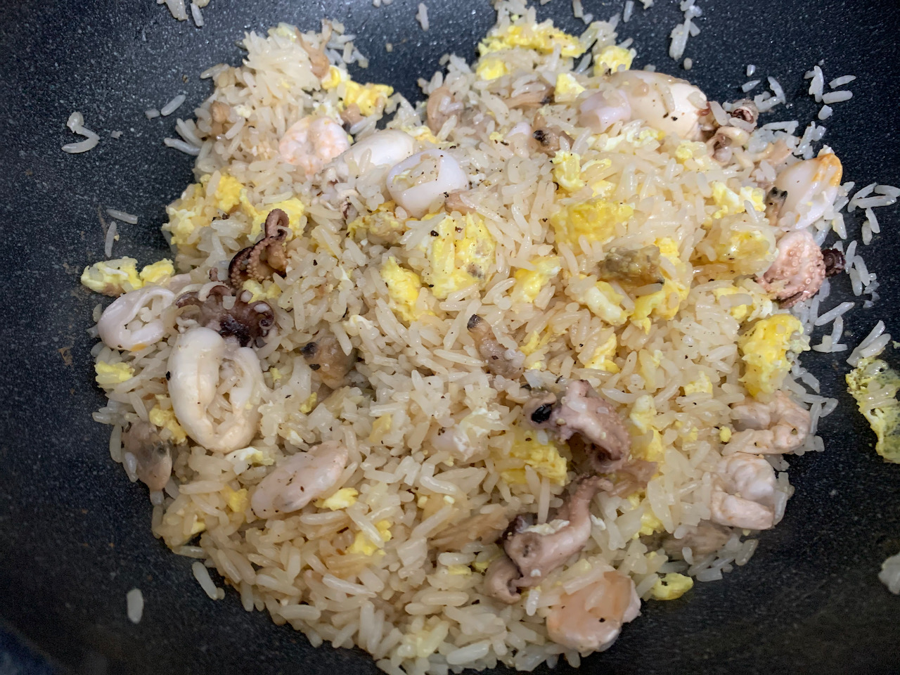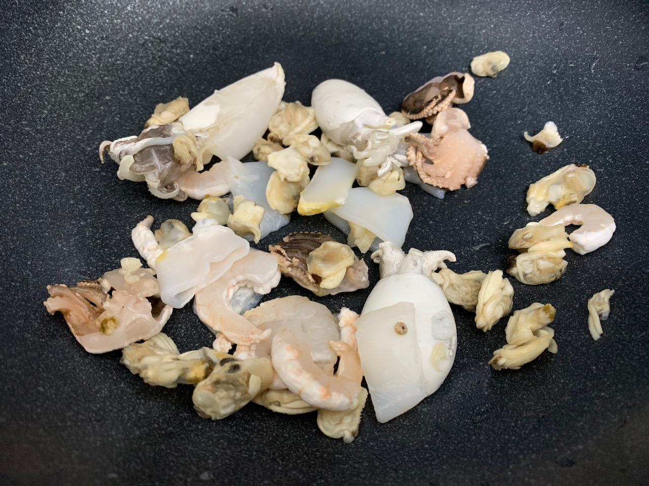 헹군 해물을 바로 팬에서 가열을 해준다. 기름을 넣기 전에 수분을 날리는 작업을 하는 것이다. 중불에서 물기가 적당히 없어질 때까지 볶는다.