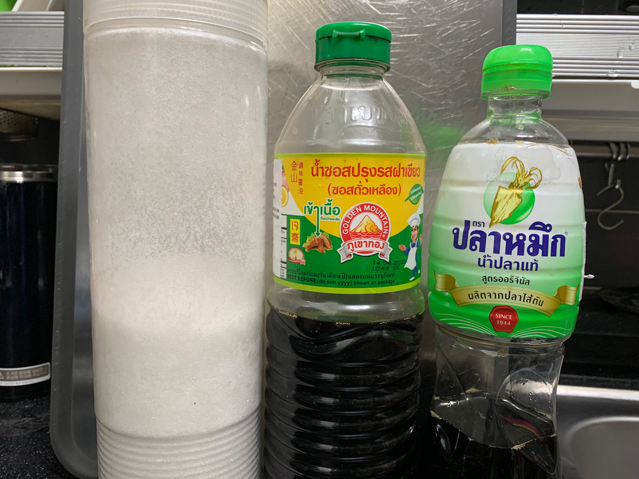 볶음밥에 들어가는 소스는 3가지다. 설탕, 간장, 피시소스. 간장은 태국 그린캡 골드마운틴인데, 맛간장이라고 생각하면 된다. 일반 간장을 사용해도 무방하고, 미원이나 치킨스톡, 파우더 등의 조미료를 사용하면 더 맛있게 만들 수 있다.