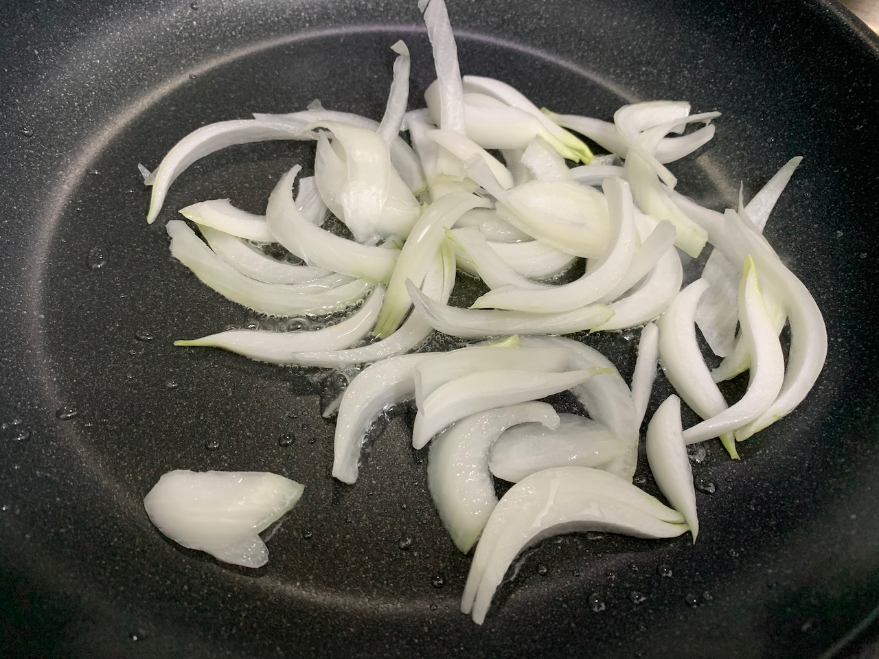 팬에 식용유 두 숟가락을 넣고 양파를 먼저 볶는다. 만약 고기를 준비했다면 고기 먼저 볶고 야채를 볶으면 된다. 1분 정도 잠깐 볶아주고 다음 작업으로 넘어간다.