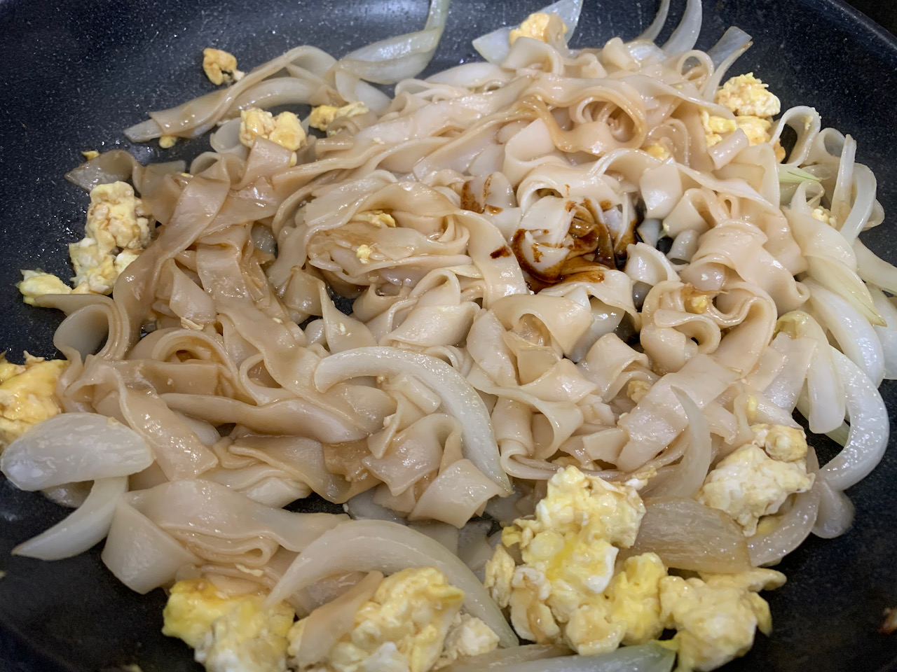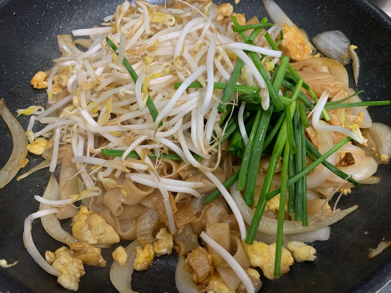 마지막으로 숙주와 쪽파(부추)를 넣는다. 강불에서 1분 이내로 볶아 완성을 하는데, 숙주는 금방 숨이 죽기도 하고 잔열로도 익기 때문에 빠르게 볶아낸다. 면을 하나 집어먹어보고 간이 부족하면 피시소스를 더 넣고 휘적휘적하여 완성한다.