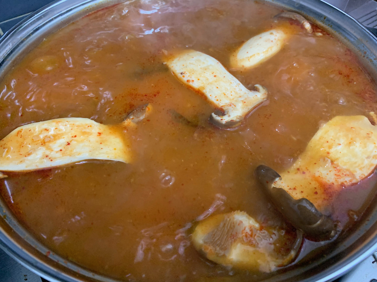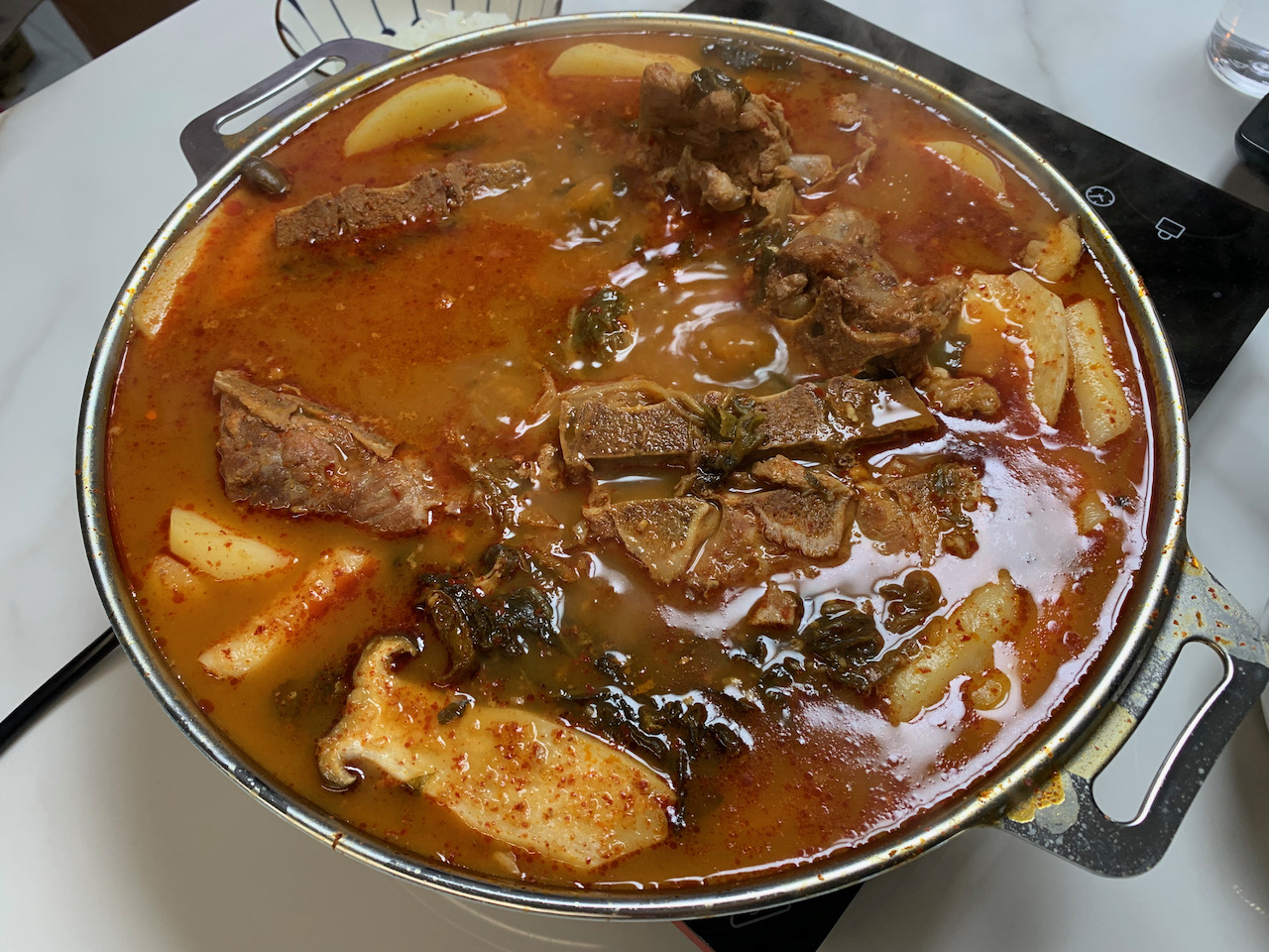 이제 뼈해장국을 감자탕으로 바꿔본다. 포장할 때 듣는 말인데, 그냥 먹으면 짜니 물을 넣으라고 말씀하신다. 2인분에 물 500ml을 넣으니 약간 싱거웠는데, 350~400ml 적당하지 않을까 싶다. 감자를 3개 정도 넣고 먼저 5분 정도 끓였다.
