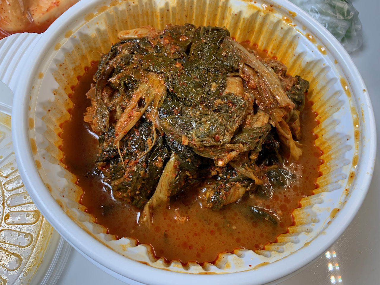 봉투에는 뼈해장국이 담긴 일회용기와 섞박지, 고추가 함께 들어있다. 처음에 나를 이 식당에 데려간 분이 섞박지는 안 달라고 하면 안 준다고 해서 일부러 달라고 말을 했다. 그런데 섞박지가 그렇게 맛있지는 않다. 이 집은 식당에서 먹어도 반찬은 매우 부실하다.
