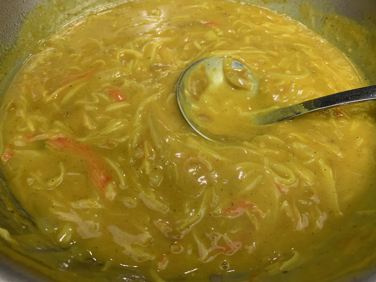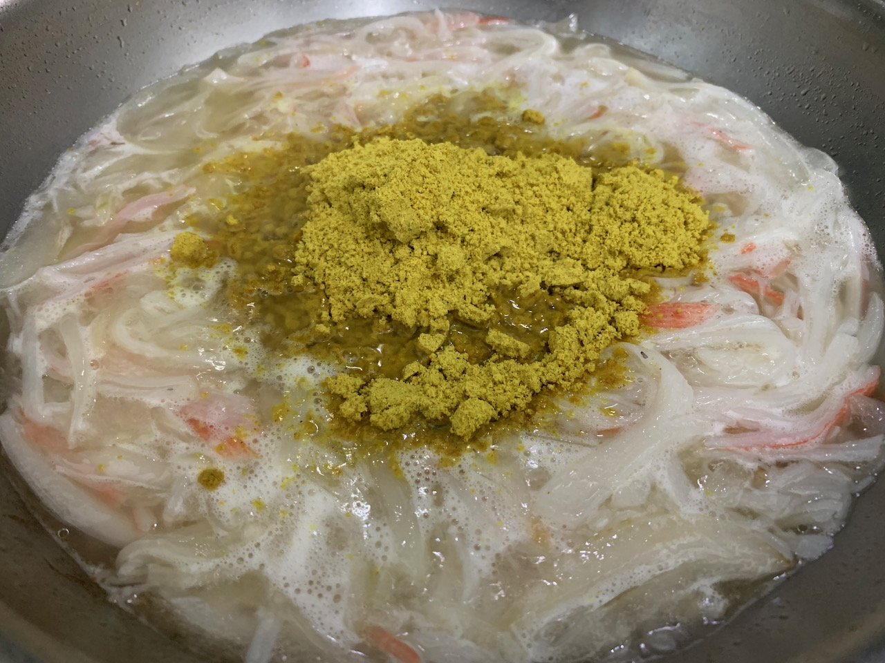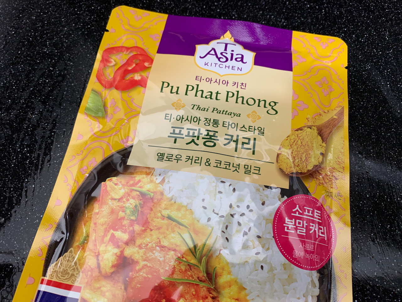 이마트에서 1+1 행사할 때 티아시아 분말 커리들을 쟁여두었는데, 그중 하나인 푸팟퐁 커리를 만들었다. 요리 주재료인 게살은 비싸기 때문에 크래미를 사용했다. 보통 크래미라 부르는 맛살은 대부분 명태고, 아주 약간의 게살액기스가 포함되기도 하는데, 그래도 게향이 첨가되어 있으니 어쨌든 게살 느낌은 난다고 치자. 사용한 것은 노브랜드 150g짜리 제품이고, 정식 명칭은 크라비.