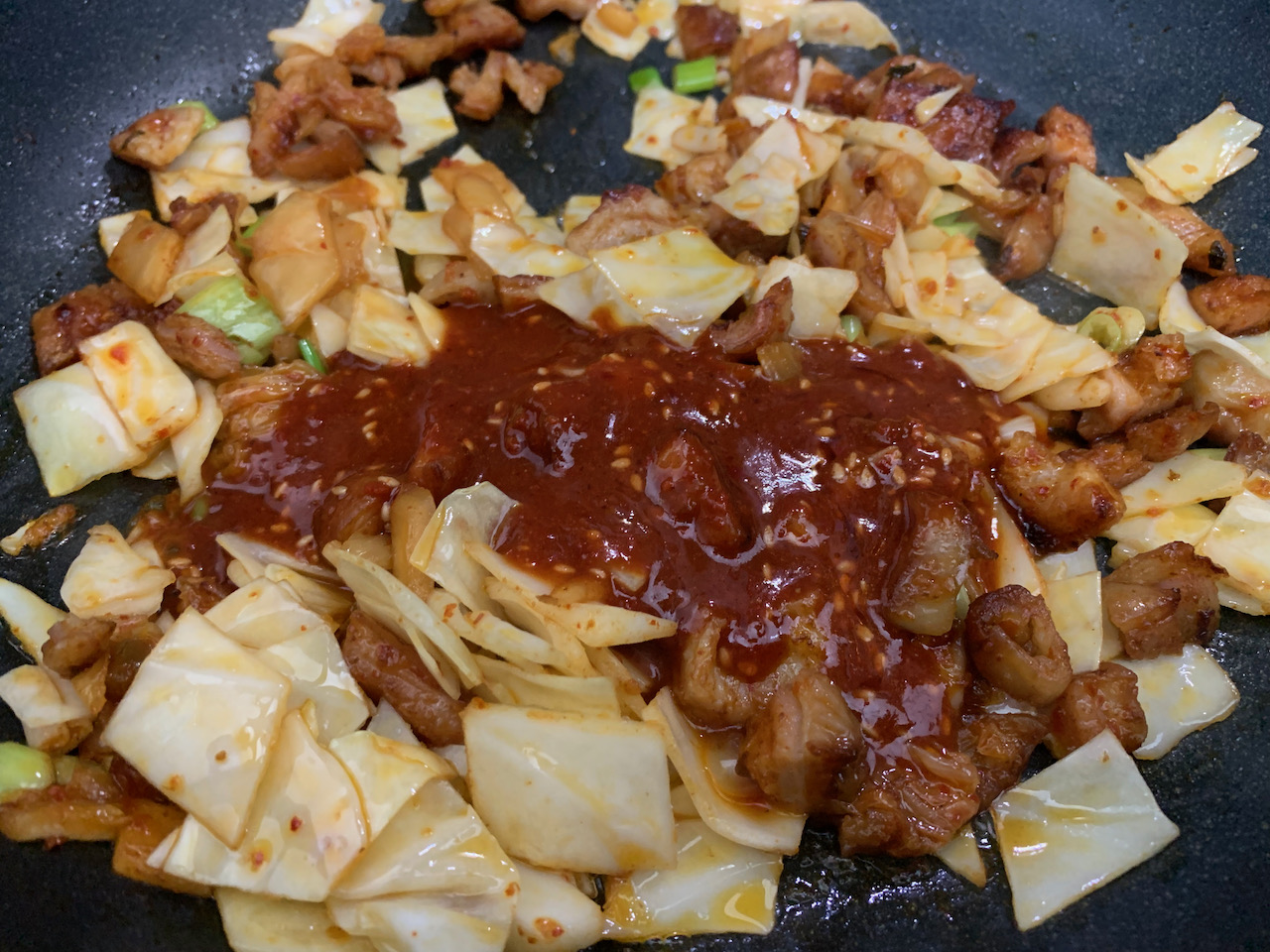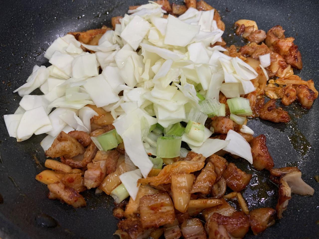 고기가 익으면 김치를 넣는다. 나는 양념장에 설탕을 넣는 것을 깜빡해서 여기서 넣어주었다. 김치가 기름에 푹 절여지도록 3분 정도 볶았다.