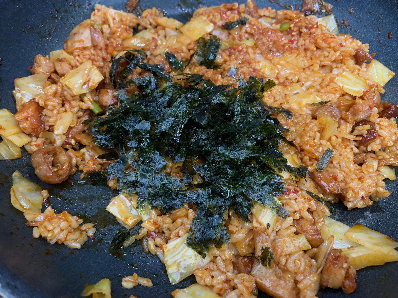 불을 중약불로 올리고 김가루를 넣어 섞는다. 조미김은 짭짤하니 너무 많이 넣으면 볶음밥이 짜진다. 김가루를 많이 넣으려면 이전에 간을 조금 부족하게 해야 한다.