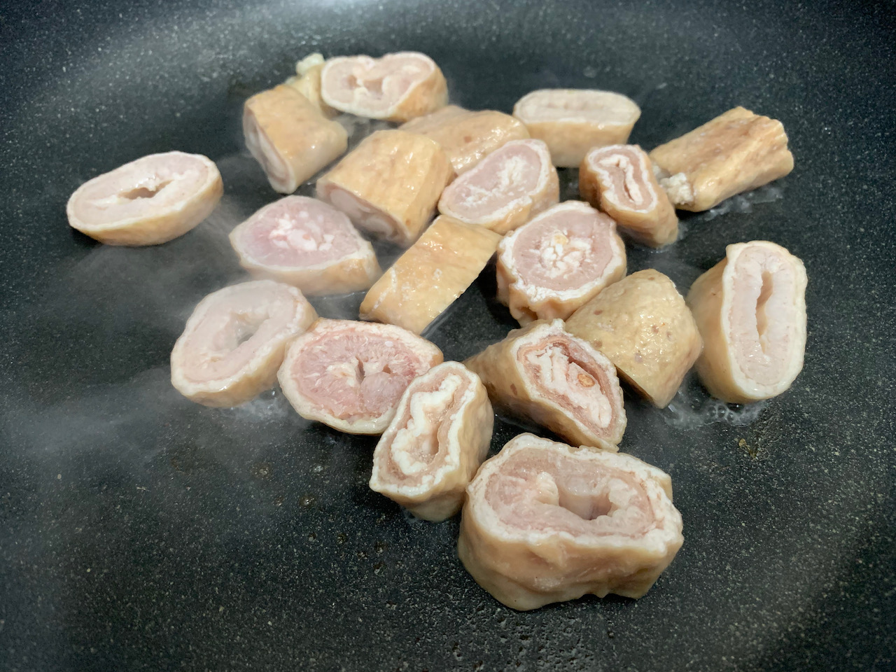 먼저 식용유를 1숟가락 넣고 막창을 잘게 잘라 색이 나게 구웠다. 기름이 있어야 맛있기 때문에, 볶고 나서도 기름이 적다 싶으면 식용유를 더 넣는다.
