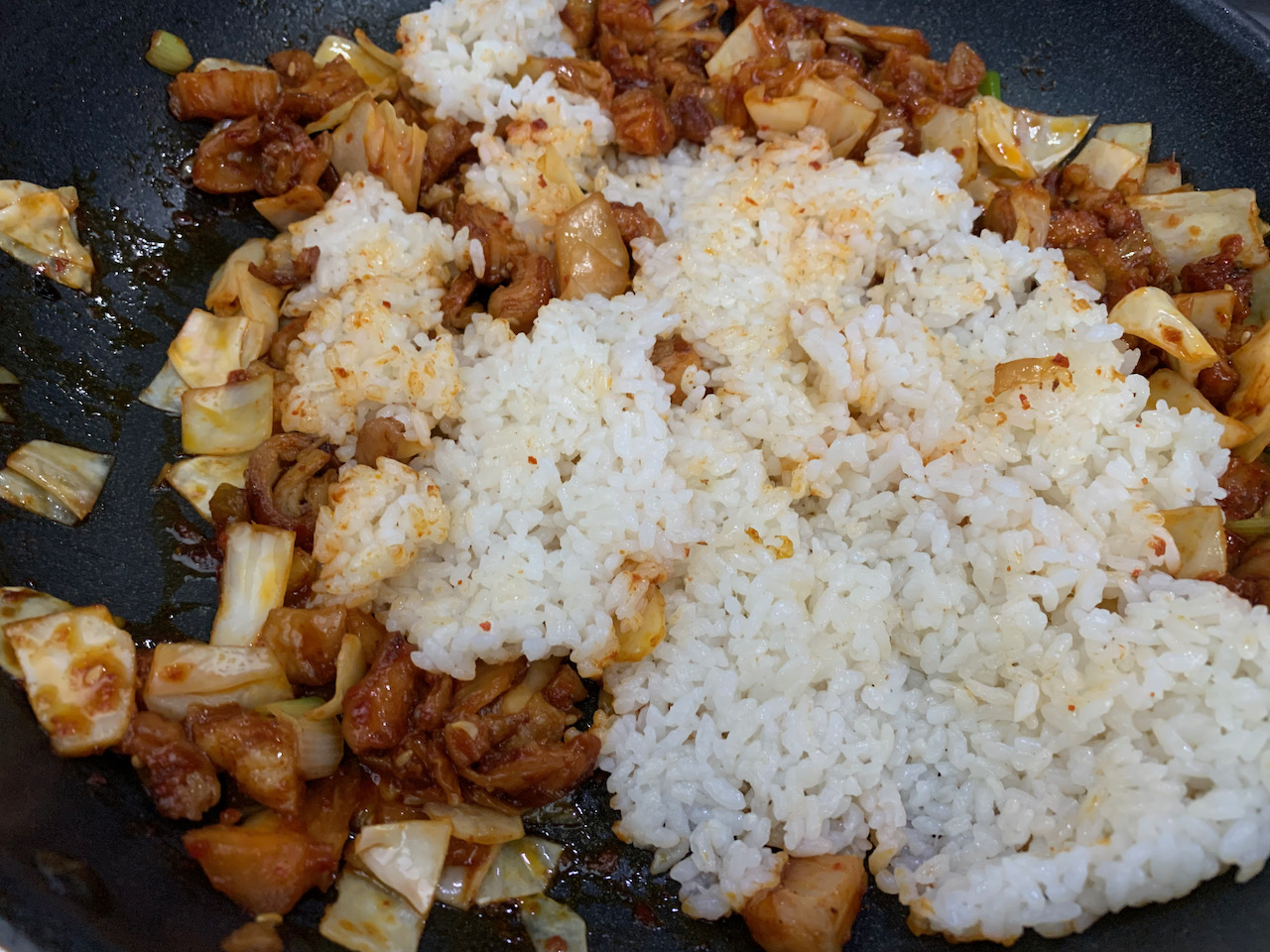 불을 약불로 줄이거나 아예 끄고서 밥을 넣어 잘 섞어준다. 그리고 간을 보고 싱겁다 느껴지면 양념장과 한두 스푼의 물을 넣어 다시 섞어준다.