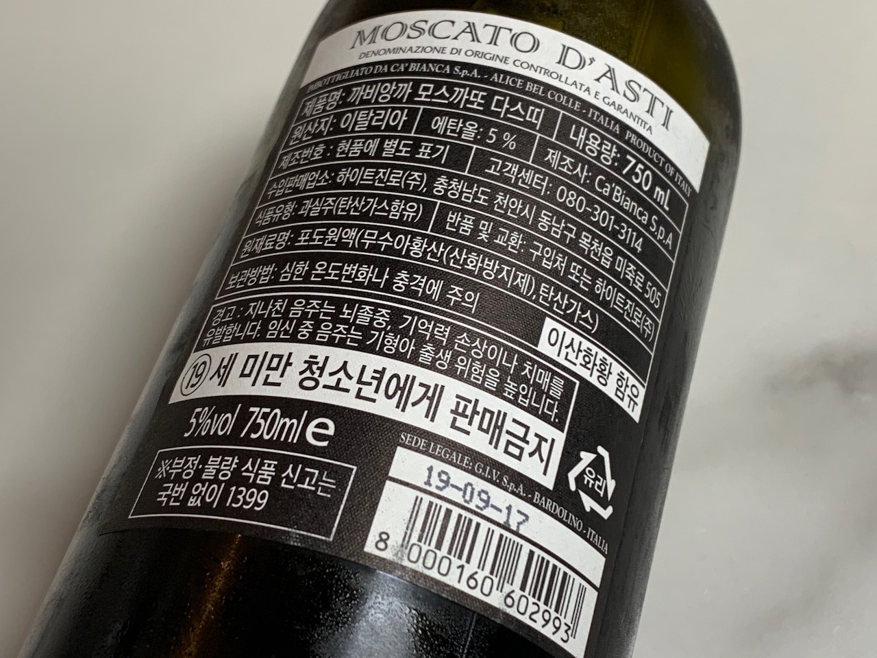 꽤 오래전에 구입했다가 냉장고 구석 안 보이는 곳에 있어 망각하고 있던 까비앙까 모스카토 다스티를 마셨다. 코스트코에서는 할인할 때 샀을 것이라 생각되고 가격은 1.5만 원 미만이었을 것이다. 개인적인 기준으로 모스카토 다스티의 구입 비용 마지노선은 1.5만 원이다. 너무 금방 마셔버려서 돈이 아깝기 때문이다.