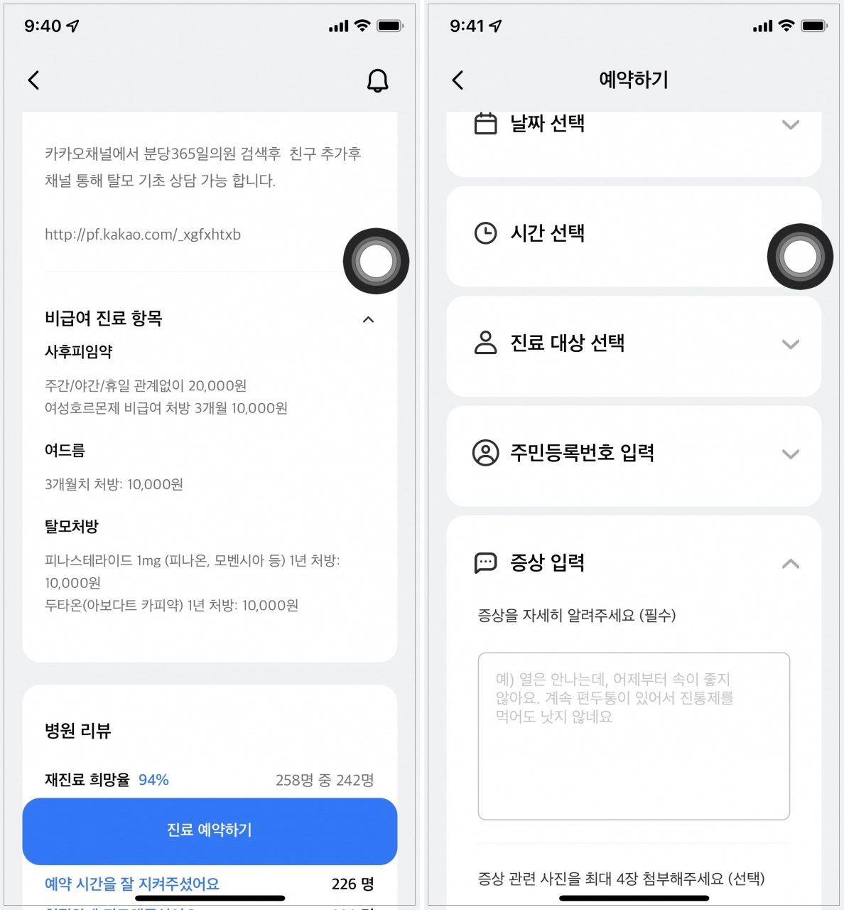 나는 무려 1년 처방에 진료비가 1만 원인 곳에 다음날 11시에 진료를 예약했다. 예약을 할 때 증상을 적고, 사진을 첨부할 수 있다. 이미 탈모약을 먹고 있다는 사실과 어떤 약을 먹고 있는지 적었고, 부끄러운 머리 사진도 찍어서 첨부했다.