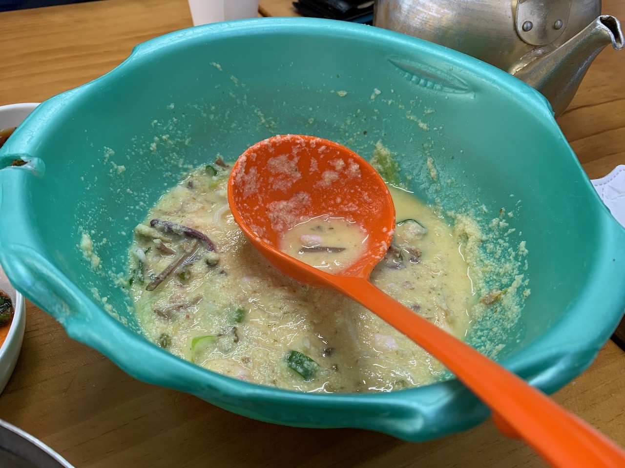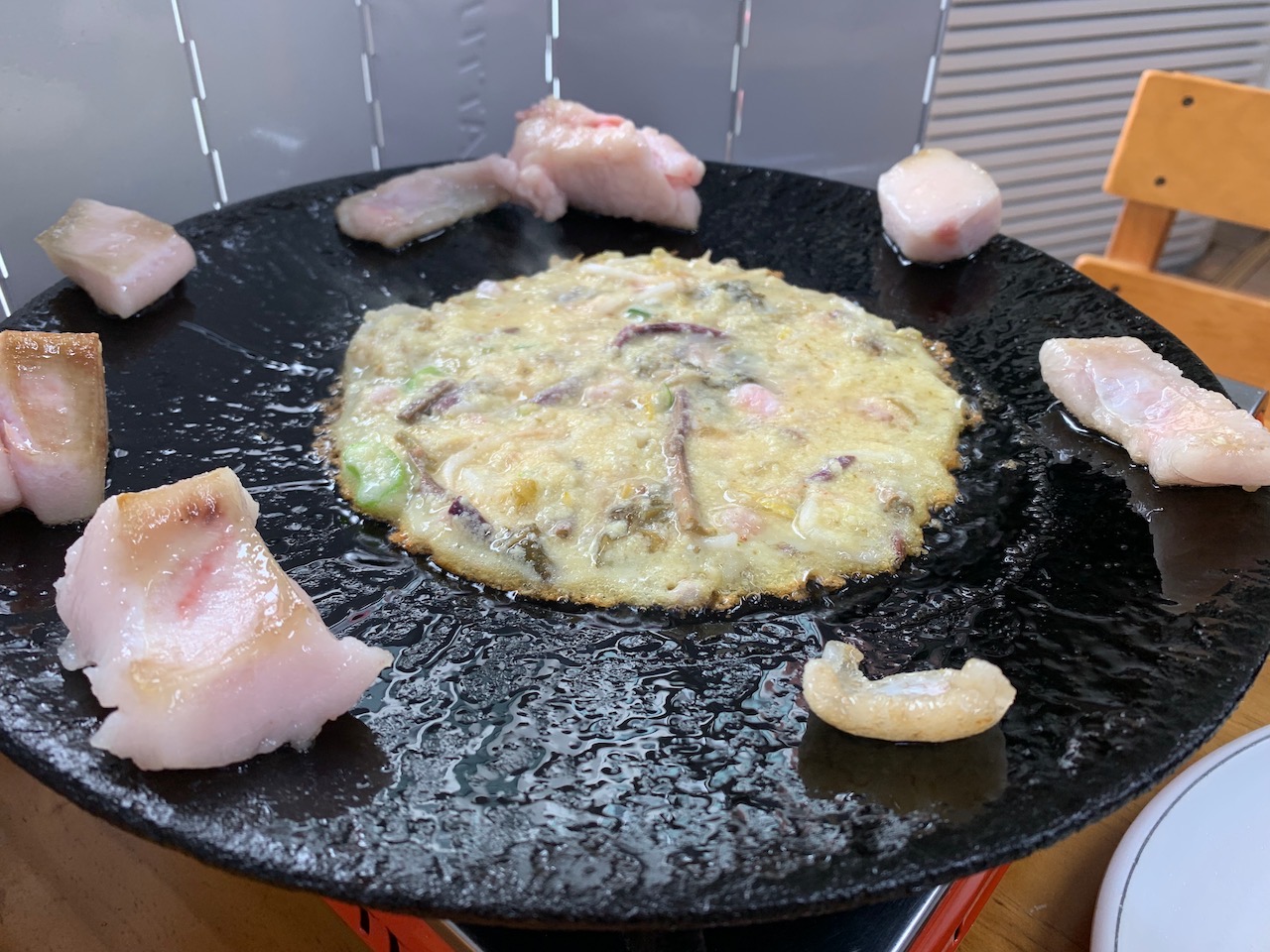 세월이 지나치게 많이 뭍은 플라스탁 바가지에 숙주와 고사리, 대파 등등이 들어간 빈대떡 반죽을 받았다. 돼지비계에 직접 부쳐먹는 것인데, 내가 너무 못한다 싶으니까 사장님께서 도움을 주셨다.