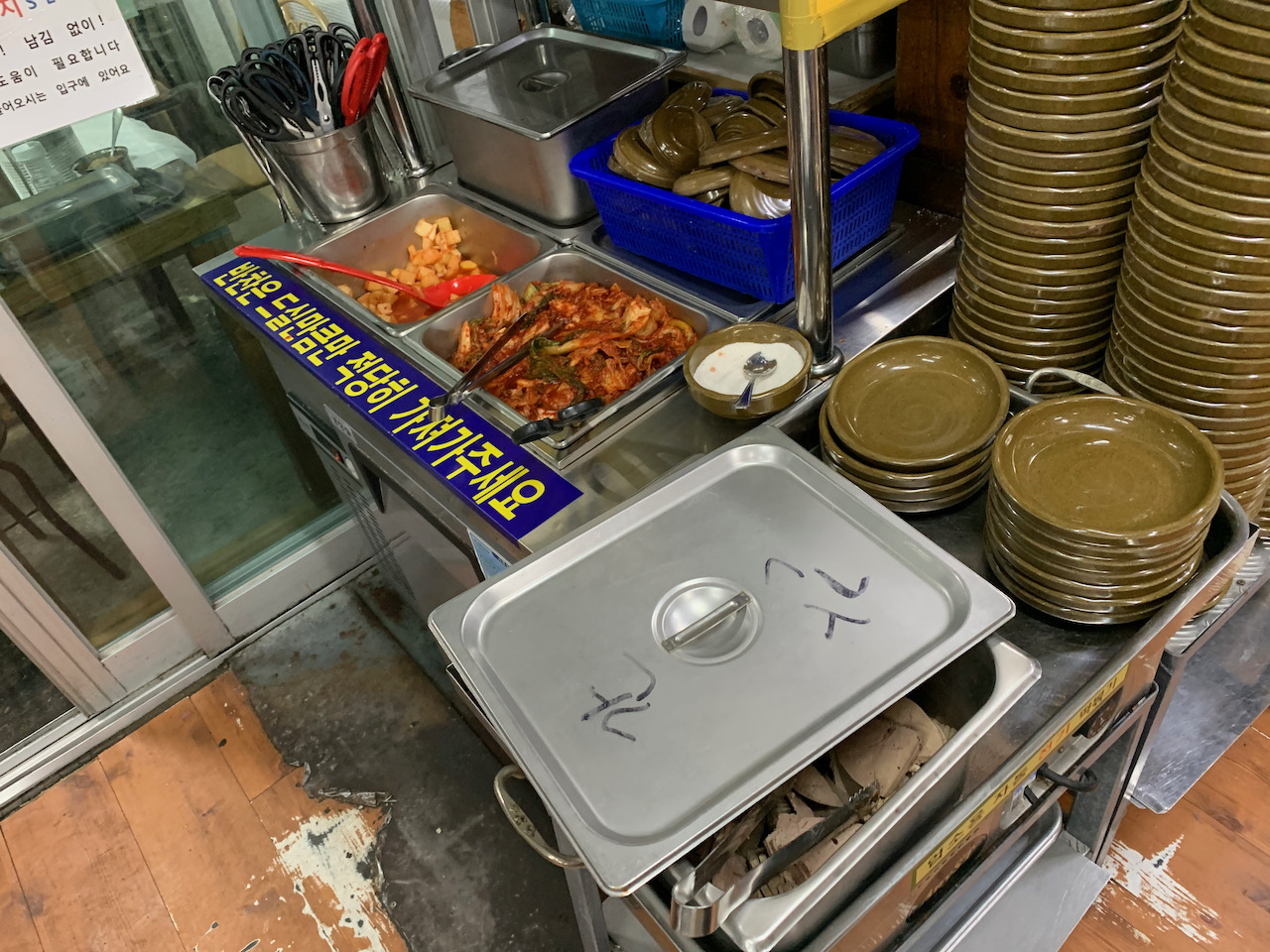 거의 18시간을 굶은 상태에서 국밥을 먹으니 한 그릇이 후딱 들어갔다. 부담스러울 정도로 큰 대파가 들어간 양념과 새우젓을 약간 넣어 간을 맞추어 먹었다. 처음부터 리필할 생각으로 밥을 반공기만 말아서 먹고 리필을 부탁드렸는데, 처음과 똑같은 한 그릇이 다시 나왔다. 종업원이 주방으로 주문을 넣을 때도 '국밥 하나요' 이런 식으로 들어갔다.